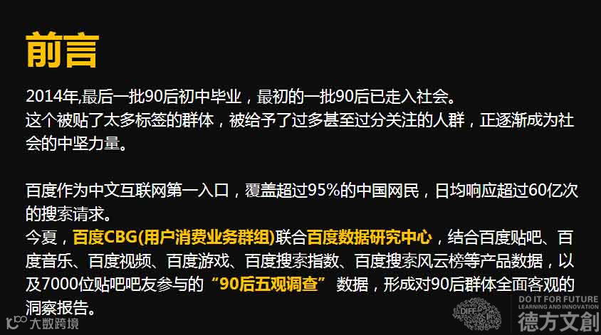 本报告由百度CBG联合百度数据研究中心结合百度贴吧、百度音乐、百度视频、百度游戏、百度搜索指数、百度搜索风云榜等产品数据,以及7000位贴吧吧友参与的“90后五观调查”(家庭观、爱情观、友情观、消费观、就业观) 结果研究撰写。