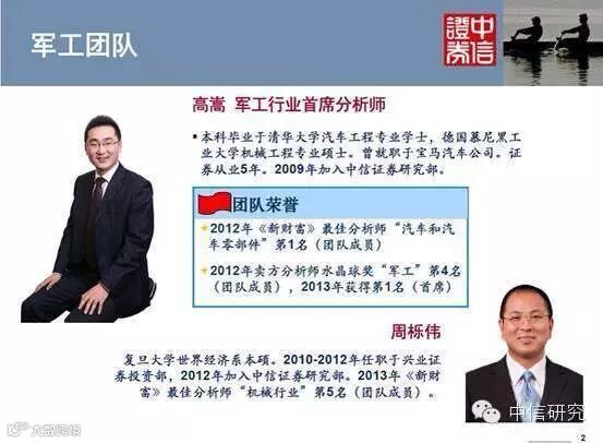 主讲人介绍:高嵩,中信证券军工行业首席分析师,本科毕业于清华大学汽车工程专业,研究生毕业于德国慕尼黑工业大学机械工程专业。证券从业5年,于2009年加入中信证券研究部。2012年所在团队被评为《新财富》最佳分析师“汽车和汽车零部件”第1名。2012年获得卖方分析师水晶球奖“军工”第4名(团队成员),2013年获得第1名(首席)。