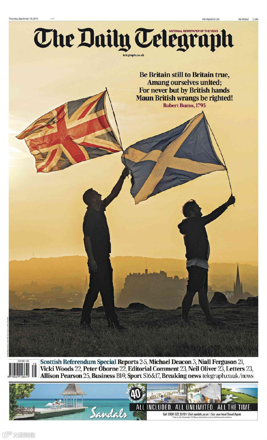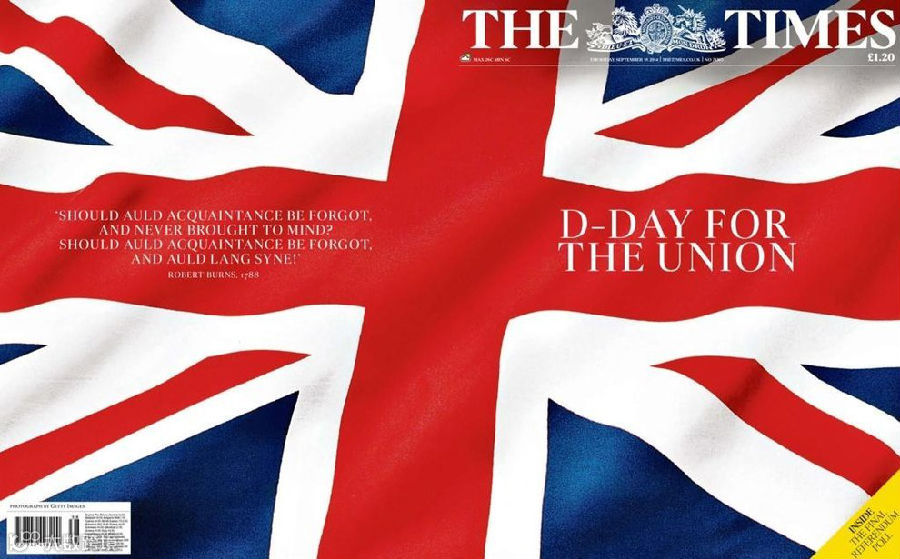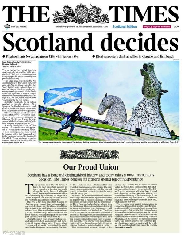 4、《泰晤士报》苏格兰版在头版下方登了一篇立场十分鲜明的社论:苏格兰公民应该抵制独立。