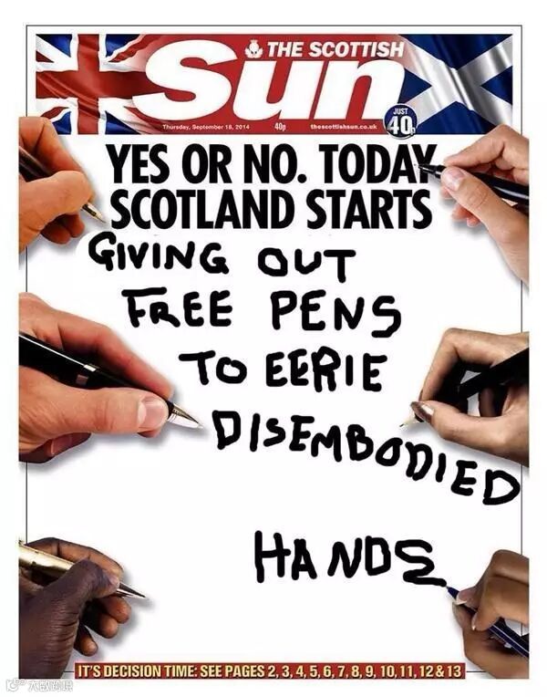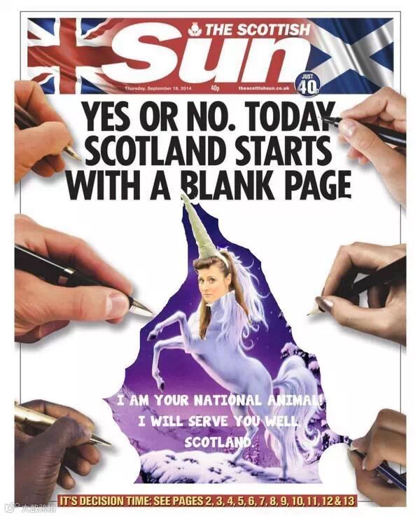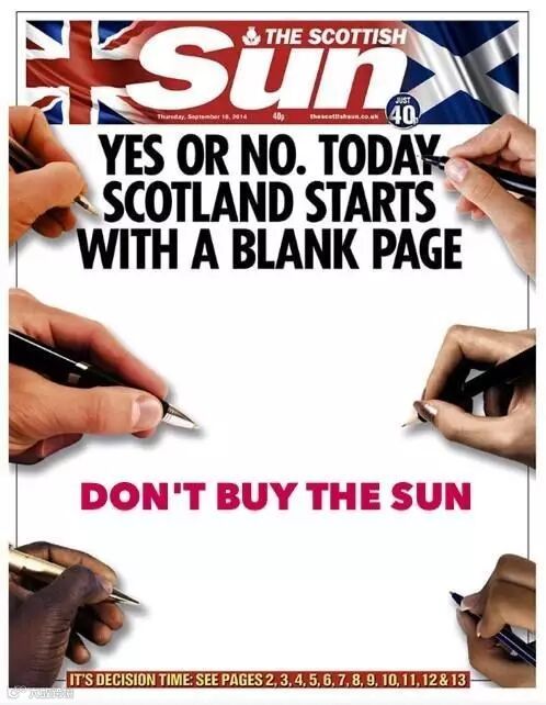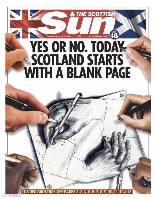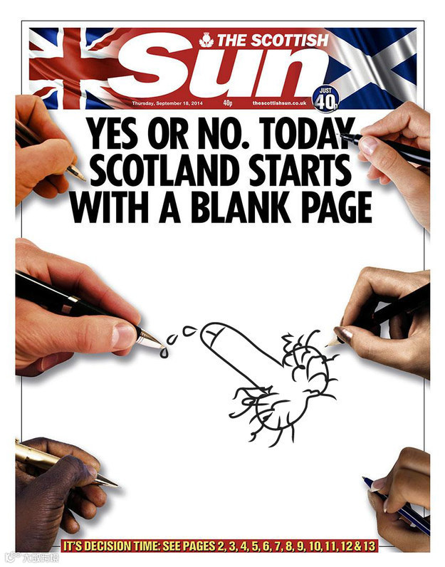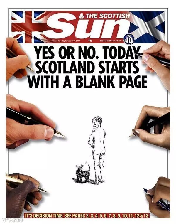 10、《太阳报》苏格兰版的标题是:不管结果是“是”还是“否”,苏格兰的历史都将在今天掀开全新的一页。在标题的下面,这份报纸特地留下了大片的空白,邀请读者参与设计。下面是一些设计作品: