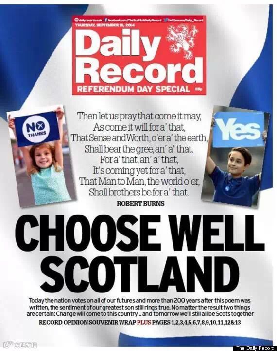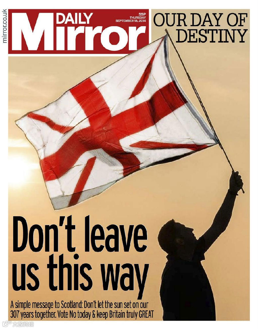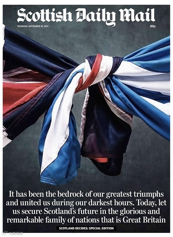 2、《每日邮报》旗下的《苏格兰每日邮报》写了一段十分煽情的话:大不列颠曾经是我们所有最伟大成就的基石,在最黑暗的日子里,也是把我们团结在一起的力量。今天,让我们在这个光荣的大家庭里,确保苏格兰的未来。