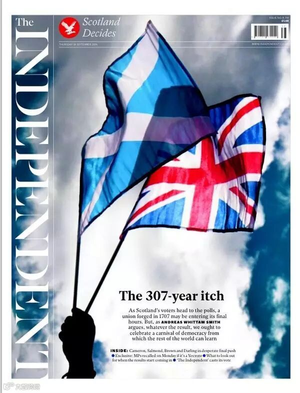 3、《独立报》的标题十分新颖:307年之痒。1707年,英格兰王国和苏格兰王国经谈判订立《联合条约》,共同成立大不列颠王国。