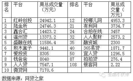 将最近一周排名列表如下,并补充了投哪儿网、有利网、合拍在线、人人聚财、融资城、365易贷、宜人贷、银客网和拍拍贷: