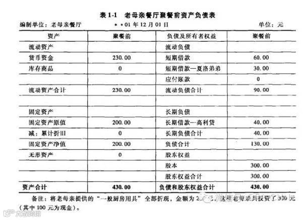从上表1-1左列(资产列),我们可以非常清楚地看出,在聚餐前,老母亲餐厅拥有资产430元,分别是230元现金和200元的厨房房产及餐厅用具等。同样,从表1-1右列(负债及所有者权益列),我们可以看出,这个家庭聚餐对外欠款时130元,其中90元是短期内需要偿还的,还有40元可以适当延期偿还,但是高利贷,利息费用比较高。