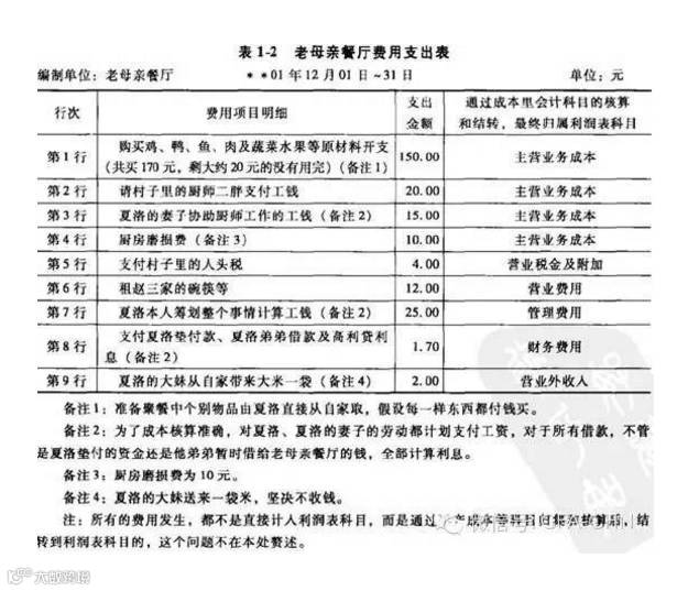 针对老母亲餐厅的例子,在做饭前编制了相应的报表,我们暂且叫它老母亲餐厅,如表1-1所示