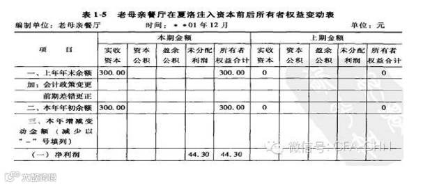 仍然以老母亲餐厅的例子来展示一下所有者权益变动表。在这里,我们假设老母亲对夏诺进行了游戏,觉得通过这次家庭聚会,还真可以再每年过年期间做这样的事情:针对那些家里没有佣人,过年还想休息的中农家庭提供聚餐服务。在**02年1月,夏诺同意出资100元,与母亲共同经营这个老母亲餐厅,主要由夏诺来经营,夏诺除了正常得到工资外,还可以按5:5来分红。这样,老母亲餐厅在夏诺注入资本前后的所有者权益变动表如图1-5所示: