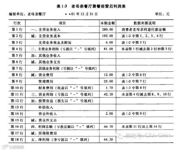 他买了鸡鸭鱼肉等,请了村子里的厨师二胖,在借高利贷时就付了高利贷的利息,由于吃饭的人太多,家里的厨具和餐具不够,于是便租赵三家的锅碗瓢盆用了12元。大家吃饭时,对这顿饭评价很好,觉得这顿饭够280元的档次,夏若的母亲的老母亲听了很高兴认为,夏若两口子辛苦了,便给了他们280元,多的当他们工钱。夏若推辞不掉便收下了,事后他一算账,刨除本钱、利息、工钱外,还赚了20元。夏若所列的这个账单就是利润表。
