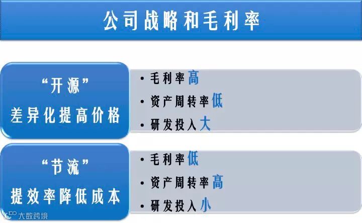 公司的战略和毛利率基本关系是什么,要不我用开源,要不就是节流。所谓的开源我通过差异化来提高价格,如果是节流,我提高效率来降低成本。我为了开源我就要把毛利率做得很高,资产的周转率可能会降低,这种情况我就把研发投入可能做得比较大一点。但是我为了节流,有可能他的毛利率是要低一点的,但是我的资产周转率会大幅提高。资产周转率就是我有1块钱的资产可以形成多少收入,如果我有1块钱的资产可以形成2块钱的收入,等于是我的资产赚了两转,我的资产周转率就是2。我为了实现我的差异化战略,可能要进行大幅的研发投入,但是如果我只是为了降低成本,我可能就不需要很多研发的投入。