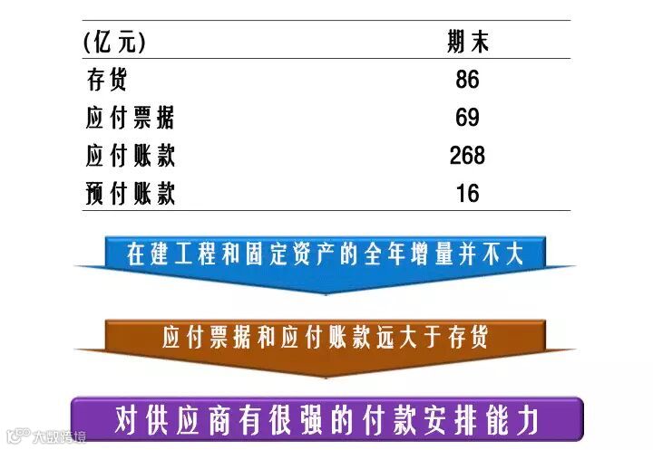 他的存货86亿,应付票据+应付账款-预付账款=310多亿,从这一点上来说,我们就可以认为是应付票据和应收账款远远大于他的存货。就像刚才所讲的道理,格力钱是不给的,货我是卖了。所以拿这个东西来看,他对供应商是有很强的付款安排能力的。