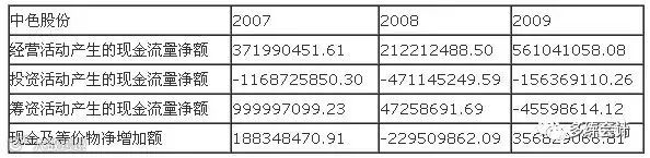 通过以上数据不难看出,该企业基本上是依靠正常经营活动来产生现金收入的,其中,投资活动产生的现金流量是负值,说明该企业基本在投资固定资产等较大的投资,以促进企业的壮大发展.而在09年度有所减缓,并且扩大投资也需要一定的筹资来弥补了。