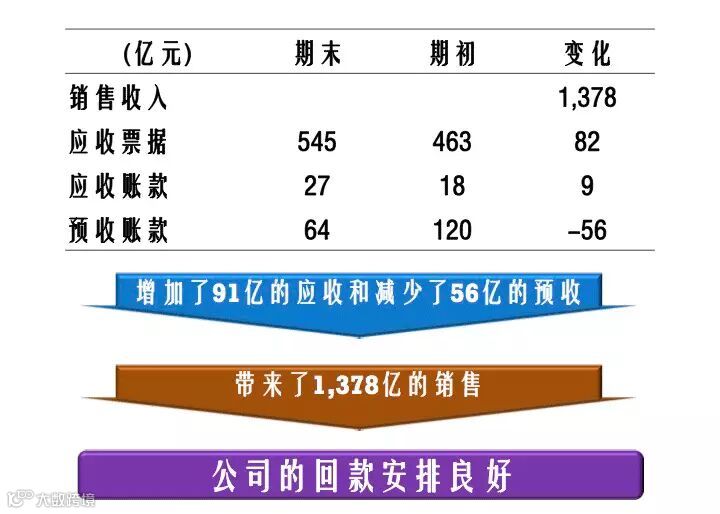 像我们刚才一开始所说的,我们要把应收账款、应收票据、预收账款和我们的营业收入做一个比较,我们的营业收入1378亿,我们把所有的这些内容给他列到一张表里面,我们就可以发现我们的营业收入他产生的是1378亿,我们的应收票据其实是增加了82亿,我们的应收账款是增加了9亿,我们的预收账款是减少了56亿。总体来说,格力在2014年的时候增加了91亿的应收账款和应收票据,减少了56亿的预收,但是他带来了1378亿的销售。也就是说他,他所增加的收不回来的钱是增加了147亿,但是他带来了1378亿的销售。大概是10%的营业收入是没有收回来的,这个公司的回款安排总体来说是非常良好的。
