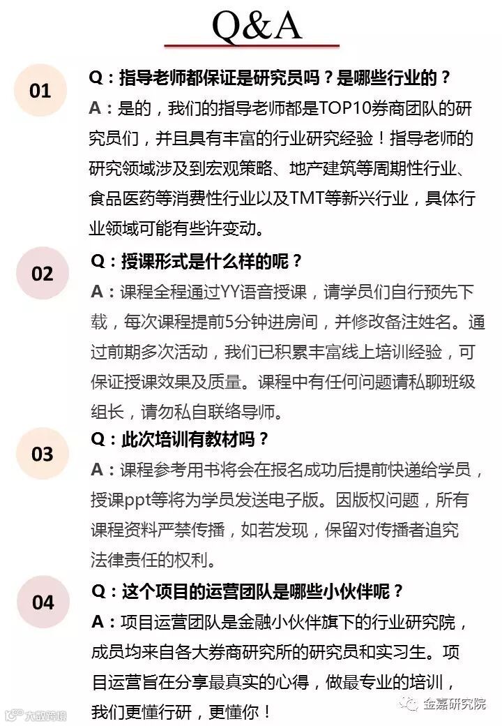 金嘉教育是中国金融教育领先品牌,旗下囊括投资银行、证券研究、资产管理等金融核心岗位培训课程,每年为数千学员提供专业培训。