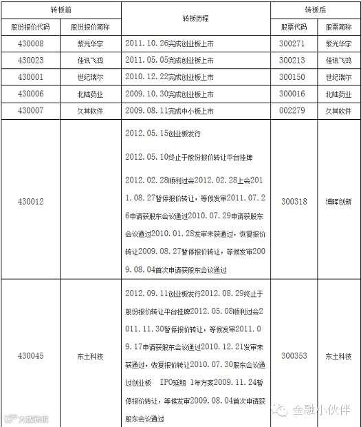 关于“转板”的条件,挂牌公司成功“转板”的关键是能够满足交易所市场的准入条件,而交易所市场的准入条件将在很大程度上与首次公开发行核准条件相衔接。因此,新三板将逐步完善市场功能体系,满足挂牌公司发展的需求,同时将与有关方面沟通协调,进一步促进与其它市场的有机衔接。以下是截止 2012年9月27日从新三板转板至创业板和中小板的基本情况: