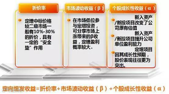 定向增发项目的收益主要是由折价率、市场波动收益(β)及个股成长性收益(α)三个因素决定的。在当前时点市场震荡调整(标的丰富、股市低价、折价率高)的态势下,参与定向增发成为个人投资者的最优选择。