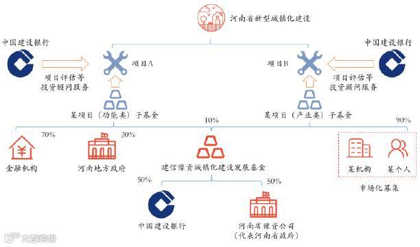 河南省新型城镇化发展基金总规模达3000亿元的基金,分为“建信豫资城镇化建设发展基金”、“交银豫资城镇化发展基金”和“浦银豫资城市运营发展基金”三个分基金。每只基金都将采用母子基金的模式运行,在省级层面设立母基金,在省辖市设立子基金。母基金按照子基金10%的规模设计,金融机构和地方政府各出资50%,通过设立子基金以股权的方式投入项目公司或母基金直接投资到项目公司。功能类(基础设施、公共服务设施和土地一级开发类)子基金具体配资构成为:母基金出资占比10%,河南省豫资公司代地方政府出资占比20%,金融机构募集资金比例为70%;产业类子基金配资构成为:母基金出资10%,其余资金通过市场化募集。