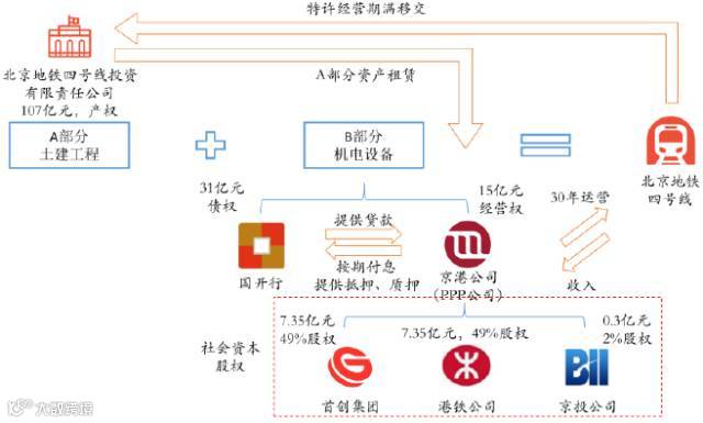 案例:国开行参与北京地铁四号线项目。北京地铁四号线项目是发改委认定的13家具有示范性的PPP项目之一,是国内首条采用PPP方式建设运营的地铁线路,运营至今始终保持盈利,是银行通过信贷模式参与PPP项目的典范。当时,北京地铁四号线项目共计需要筹资153亿元,其中46亿元用于机电设备投资,由京港地铁公司负责投资建设。京港地铁公司的三家股东(港铁公司、首创集团和京投公司)共计筹资15亿元作为项目资本金,其余31亿元全部来自国开行贷款。国开行按基准利率给与京港地铁公司期限为25年的长期贷款,同时要求京港公司提供抵押或质押。京港公司从北京地铁四号线的经营中获得营业收入,并按贷款协议偿还利息。