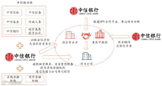 银行不仅可以通过各种渠道为项目和项目公司提供融资服务,还可以为项目提供一系列的综合金融服务。具有集团优势的商业银行(如中信银行、平安银行等)在这种模式上有着天然的优势,集团旗下各公司既可以发挥自身优势参与项目前中后期的流程,也可以与中信银行组成联合体扮演社会资本方,对政府具有很大的吸引力,为其顺利拿下PPP项目奠定基础。