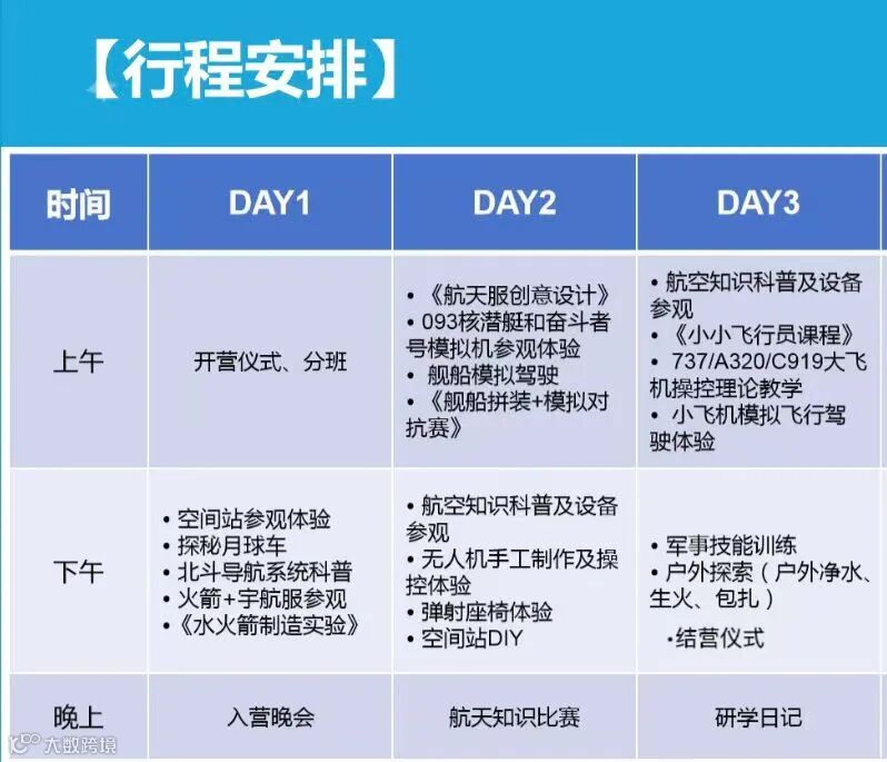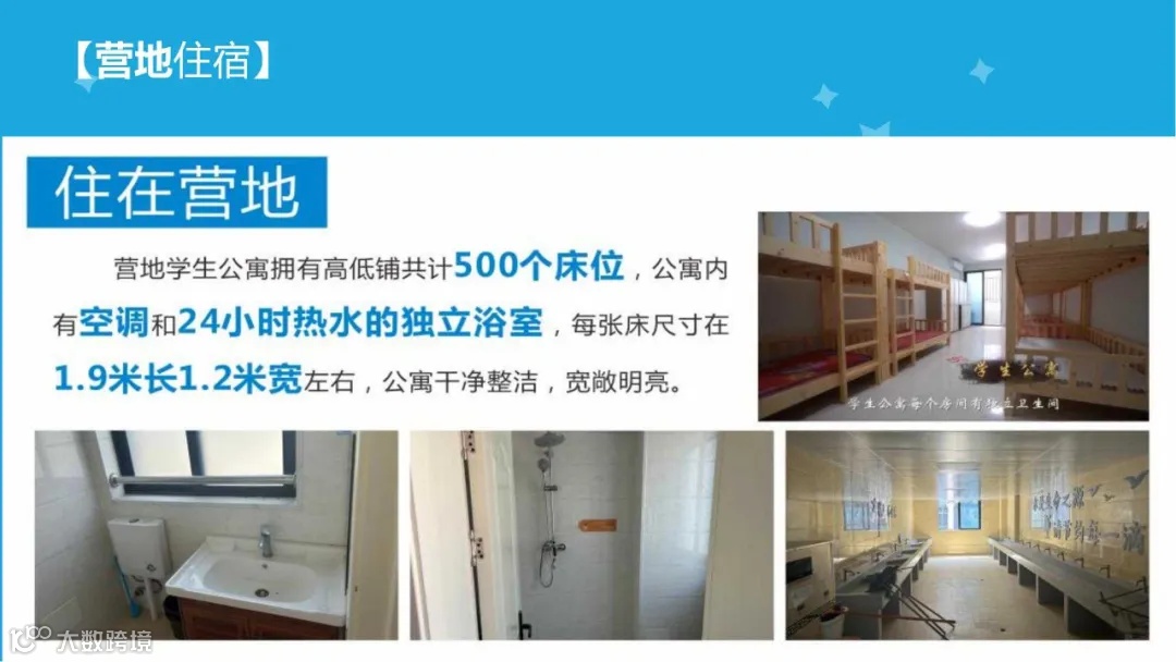 ►报到时间开营当天 8:30-10:00;10:00-12:00 整理内务及开营迎新仪式,下午安排军训及相关课程,晚上观影和亲情电话。