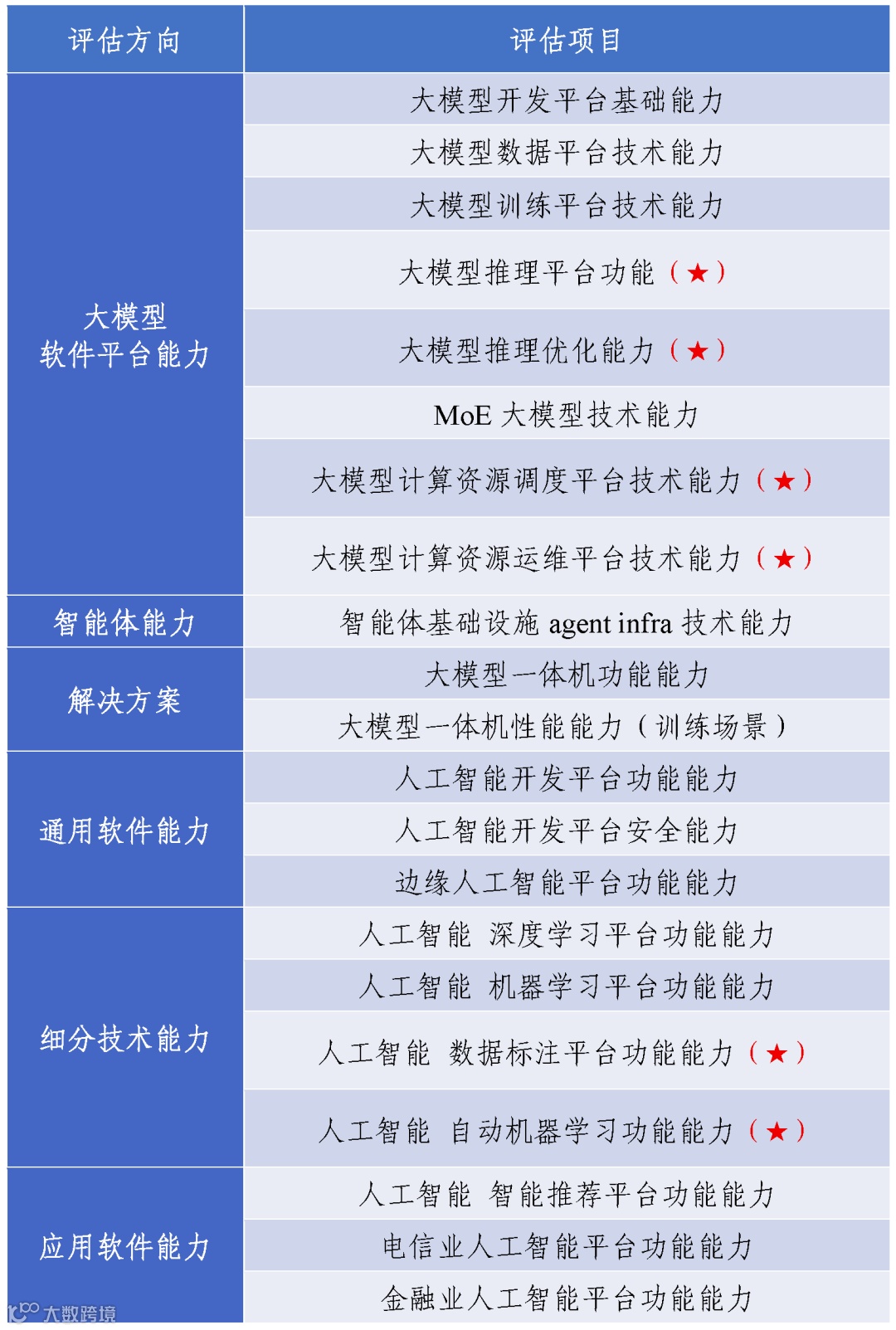 评估面向技术提供方与使用方双主体,聚焦大模型软件平台、智能体基础设施、大模型计算资源平台、大模型一体机、边缘AI平台、AI中台等主流产品形态。共设置20项核心评估内容,全面覆盖基础功能、优化技术、训推性能与稳定性等核心能力,为平台建设方提供技术优化方向与能力认证依据,助力其提升产品竞争力与场景适配能力;同时为行业用户提供权威、清晰的选型参考,有效降低技术选型与落地试错成本,推动AI基础设施规范化、规模化落地,为人工智能深度赋能千行百业筑牢坚实底座。具体评估项目如下: