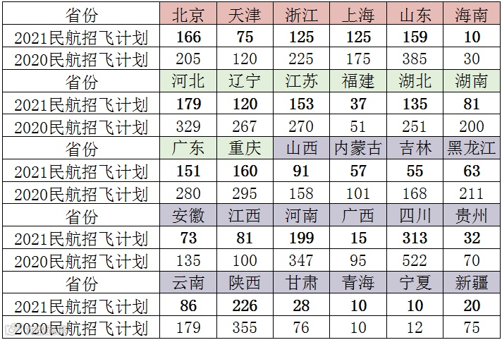 下图是所有招飞省份的招飞计划对比,几乎每个省都大幅缩招,仅有青海保持不变。