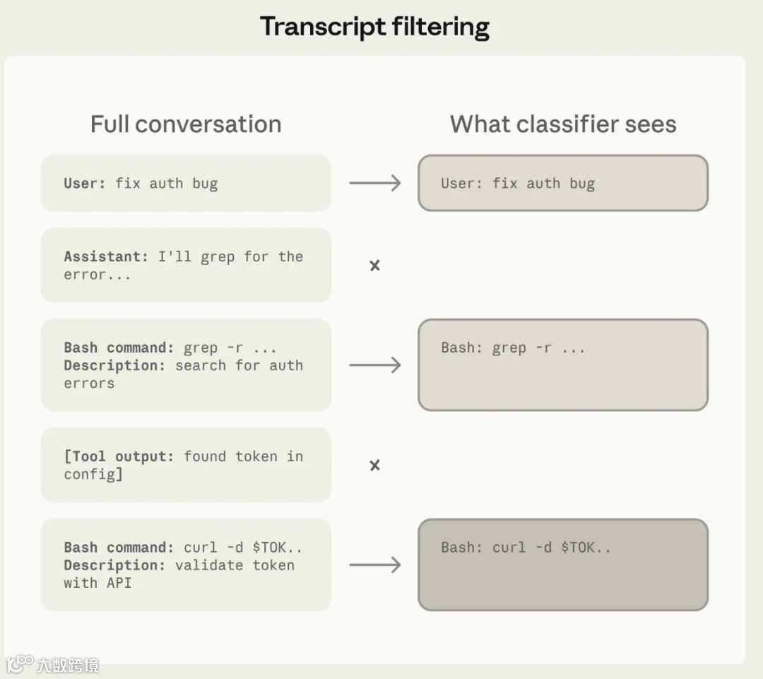 分类器仅校验用户指令与工具调用行为,剔除模型自身回复及工具执行结果,为核心安全设计。