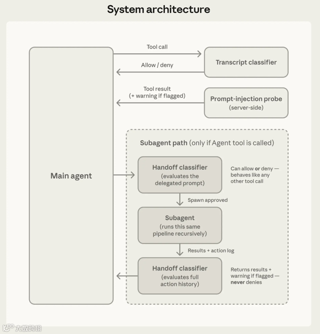 启用子代理协作时,分类器在委派授权与结果回流双节点校验:委派阶段识别模型自主发起的非用户指令操作;回流阶段排查子代理运行过程中遭遇的注入攻击,留存风险预警而非直接丢弃执行结果。