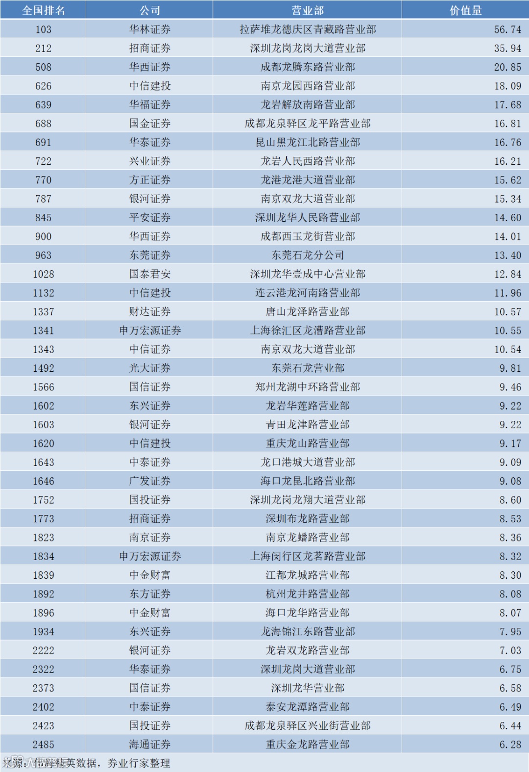 其中,华林证券拉萨堆龙德庆区青藏路营业部,以56.74的价值量居于行业第103位。招商证券深圳龙岗龙岗大道营业部,位列第212位;华西证券成都龙腾东路营业部,位列第508位。华福证券龙岩解放南路营业部位列第639,连同兴业证券龙岩人民西路营业部、东兴证券龙岩华莲路营业部,三家网点在福建龙岩位列三甲。