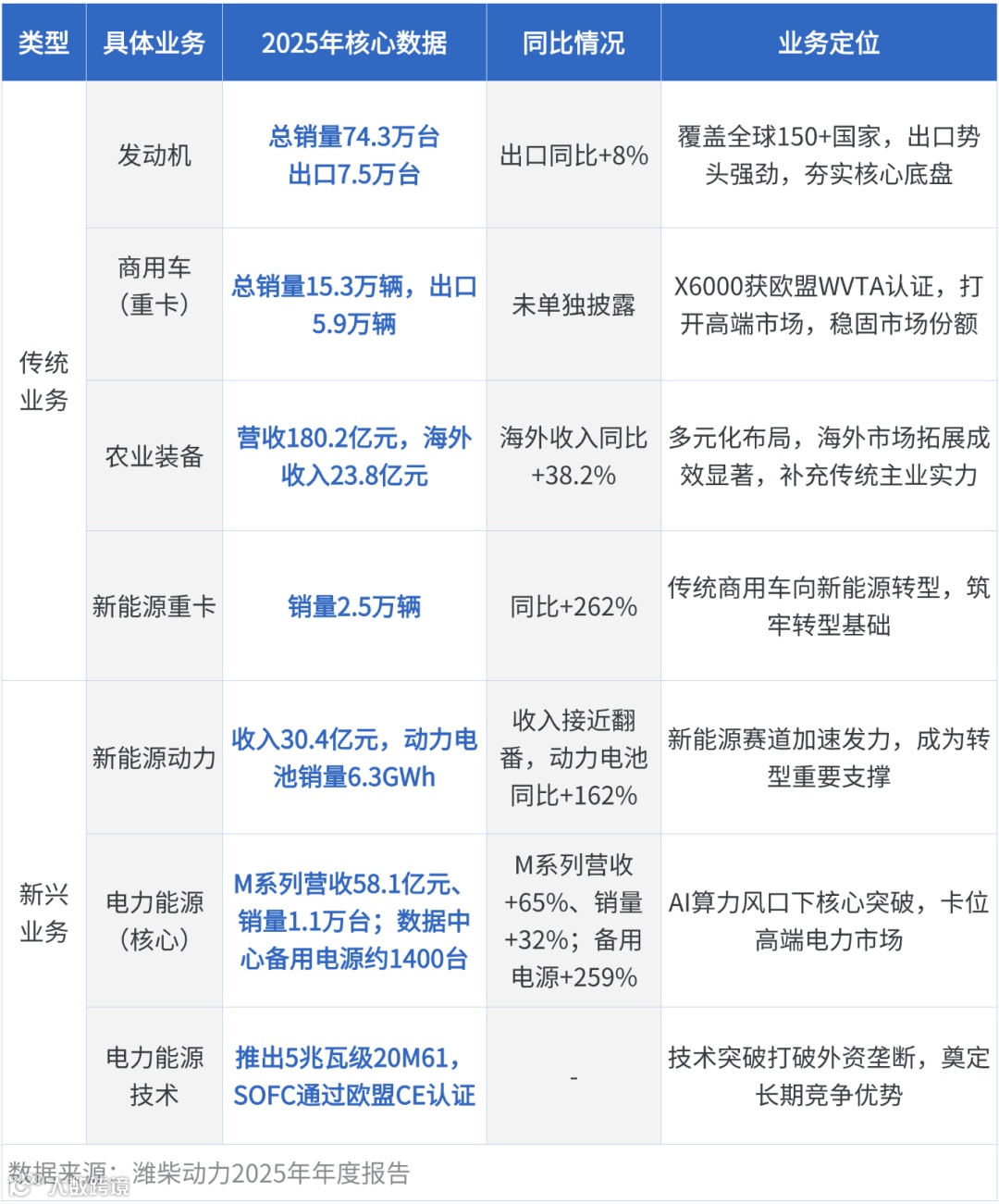 面对AI算力爆发带来的的数据中心电力刚需,潍柴提前布局大缸径发动机、SOFC等核心产品,精准踩中行业红利,实现电力能源业务爆发式增长。2025年,M系列大缸径发动机营收同比增长65%,数据中心备用电源销量同比激增259%,海外销量占比达50%,这种“前瞻布局、顺势而为”的策略,避免了转型的盲目性,让新兴业务快速实现规模化、商业化。