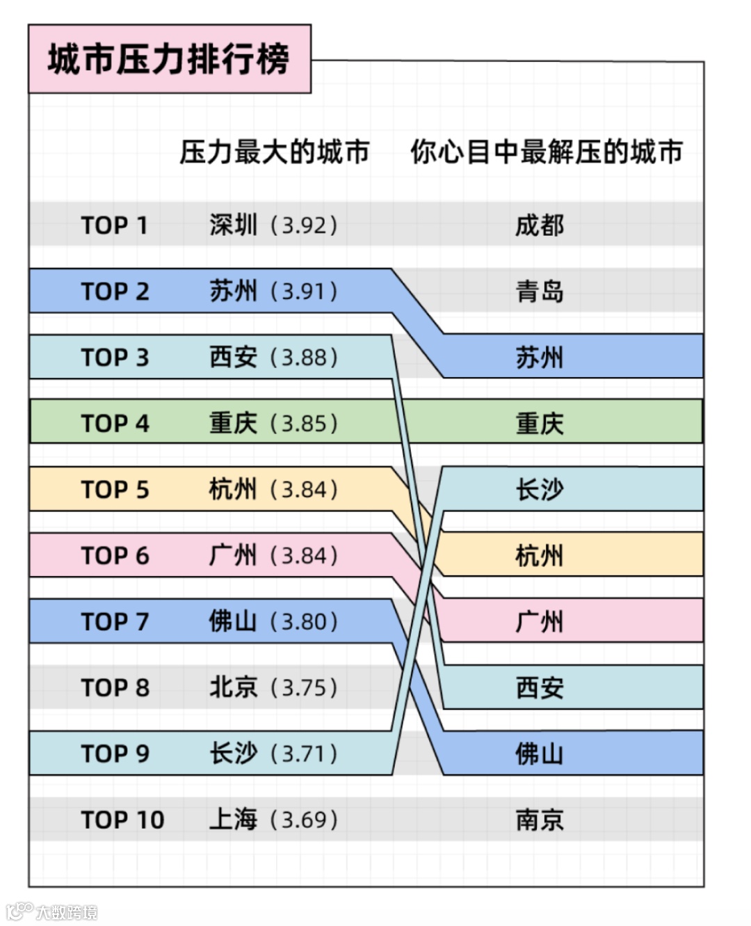 同时最解压的城市冠亚军分别是成都、青岛。有趣的是,压力最大的第二名苏州也被排名到解压的城市第三名。(金融小伙伴,快进你的职业成长。想要找金融实习、求职/跳槽到金融行业的朋友们,可添加VX:feifan00999)