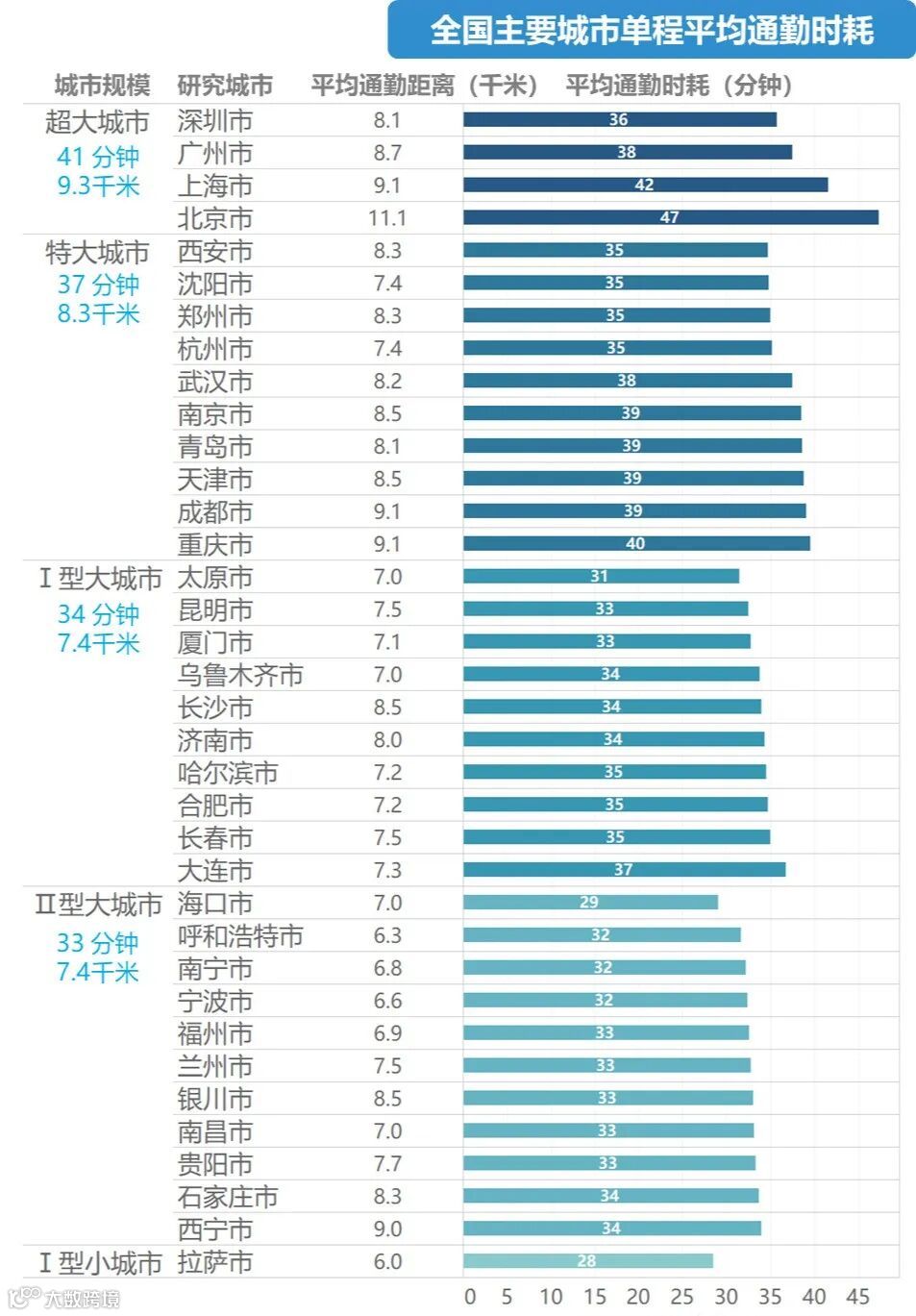 数据显示,全国主要城市45分钟以内通勤比重76%。超大城市45分钟通勤人口比重仅有69%,特大城市74%、Ⅰ型大城市80%、Ⅱ型大城市83%。