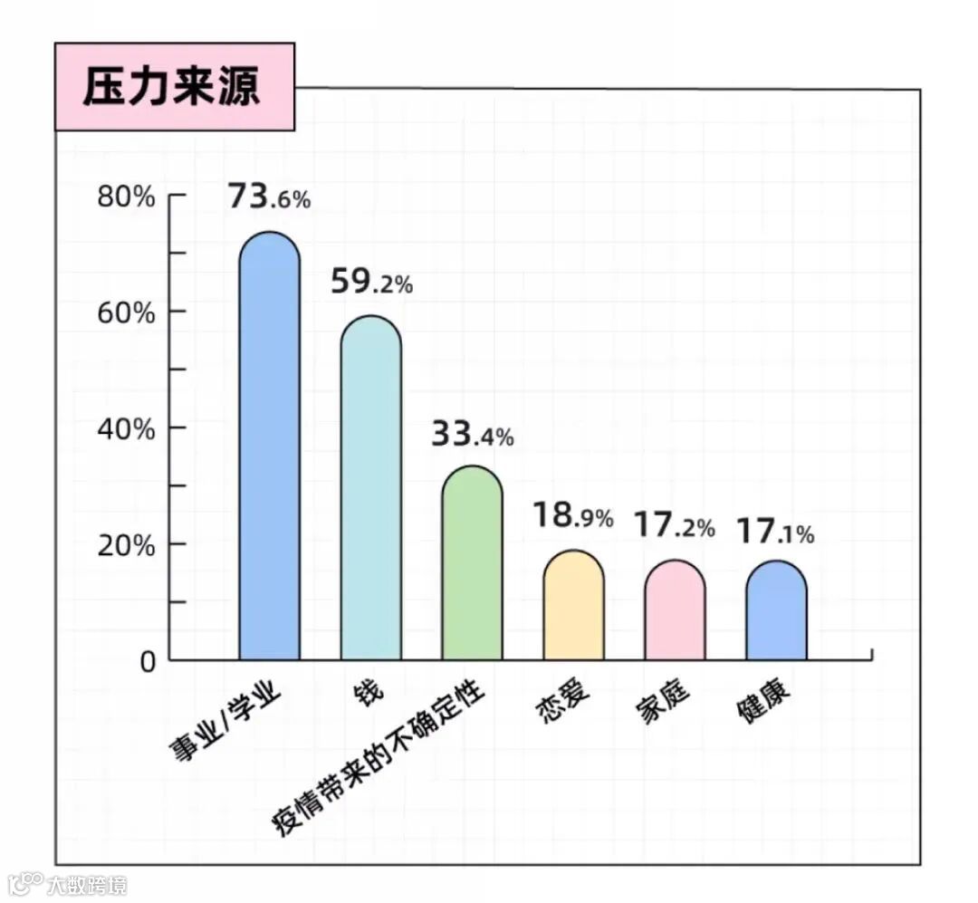 现在疫情的影响之下,从统计数据来看,事业和学业压力源占到了70%以上,金钱的压力占到了60%以上,疫情则只在30%多,事业、钱和生活的不确定感,对我们来说是排名最前的。
