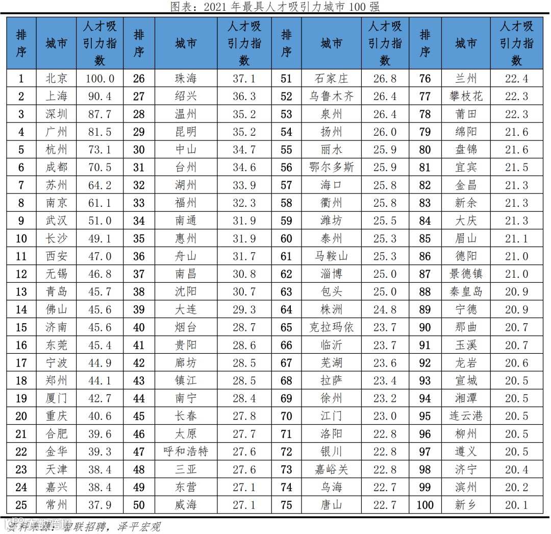 根据中国人才吸引力城市100强里,2021年北京、上海、深圳、广州、杭州、成都、苏州、南京、武汉、长沙位居前十。