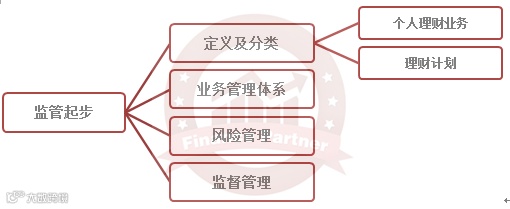 2005年《商业银行个人理财业务管理暂行办法》和《商业银行个人理财业务风险管理指引》对于商业银行理财业务的定义和管理体系、风险管理体系做出规定。2006年《商业银行开办代客境外理财业务管理暂行办法》对商业银行代客境外理财业务进行规定,进一步细化、规范了银行理财资金投资境外市场的行为。最开始的法律法规从银行理财的定义与分类、管理体系、业务管理体系、风险管理、监督管理4个方面对银行理财业务作出规定,商业银行理财业务正式纳入监管范畴。