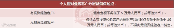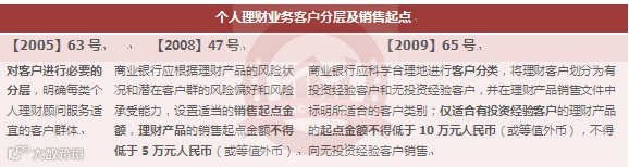 从【2005】63号规定保证收益理财计划的起点金额,人民币应在5万元以上,其他理财计划和投资产品的销售起点金额应不低于保证收益理财计划的起点金额到【2008】47号规定理财产品的销售起点金额不得低于5万元人民币,再到【2009】65号仅适合有投资经验客户的理财产品的起点金额不得低于10万元人民币(或等值外币),不得向无投资经验客户销售。新文件对于银行所有理财产品的销售起点进行了统一,且根据有无投资经验对客户设置不同销售起点。体现了政策对于有投资经验客户的高门槛准入和保护无经验投资者的原则,符合市场发展和风险防控的要求。