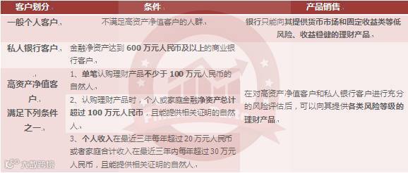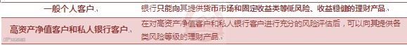 银行开展理财业务销售活动应按照风险匹配的原则,严格区分一般个人客户、高资产净值客户和私人银行客户,理财产品销售的分类管理进行,提供适应不同类型客户投资需求和风险承受能力的产品,严格风险自担。