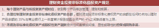 合理控制理财资金投资非标准化债权资产的总额,理财资金投资非标准化债权资产的余额在任何时点均以理财产品余额的35%与商业银行上一年度审计报告披露总资产的4%之间孰低者为上限 |