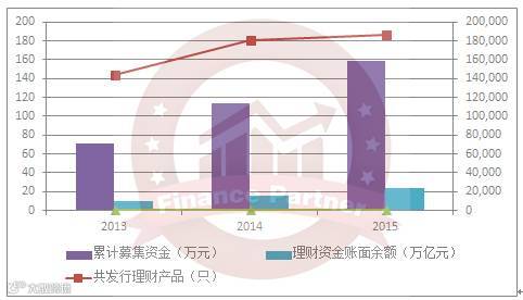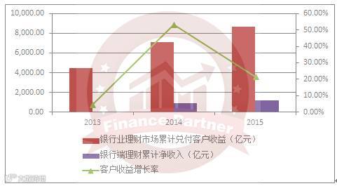 2、规模分析:2015年中国银行业理财市场年度报告指出,2015年底,共有426家银行业金融机构有存续的理财产品,理财产品数60,879只,理财资金账面余额23.50万亿元,较2014年底增加8.48万亿元,增幅为56.46%。理财产品为客户带来丰厚回报。2015年,银行业理财市场累计兑付客户收益8,651.0亿元,比2014年增长1,529.7亿元,增幅21.48%。以下两图从理财资金募集方面和收益方面分析银行理财的规模及趋势: