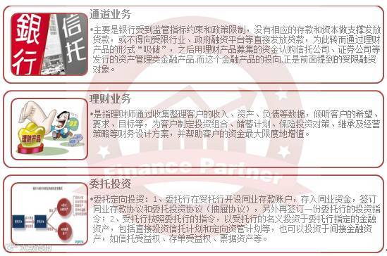 银行资产管理主要分为3大业务:通道业务、理财业务和委托投资业务通道类业务,其中通道业务主要包括银信、银证、银基和银保通道合作业务,以下是对3类业务的详解。