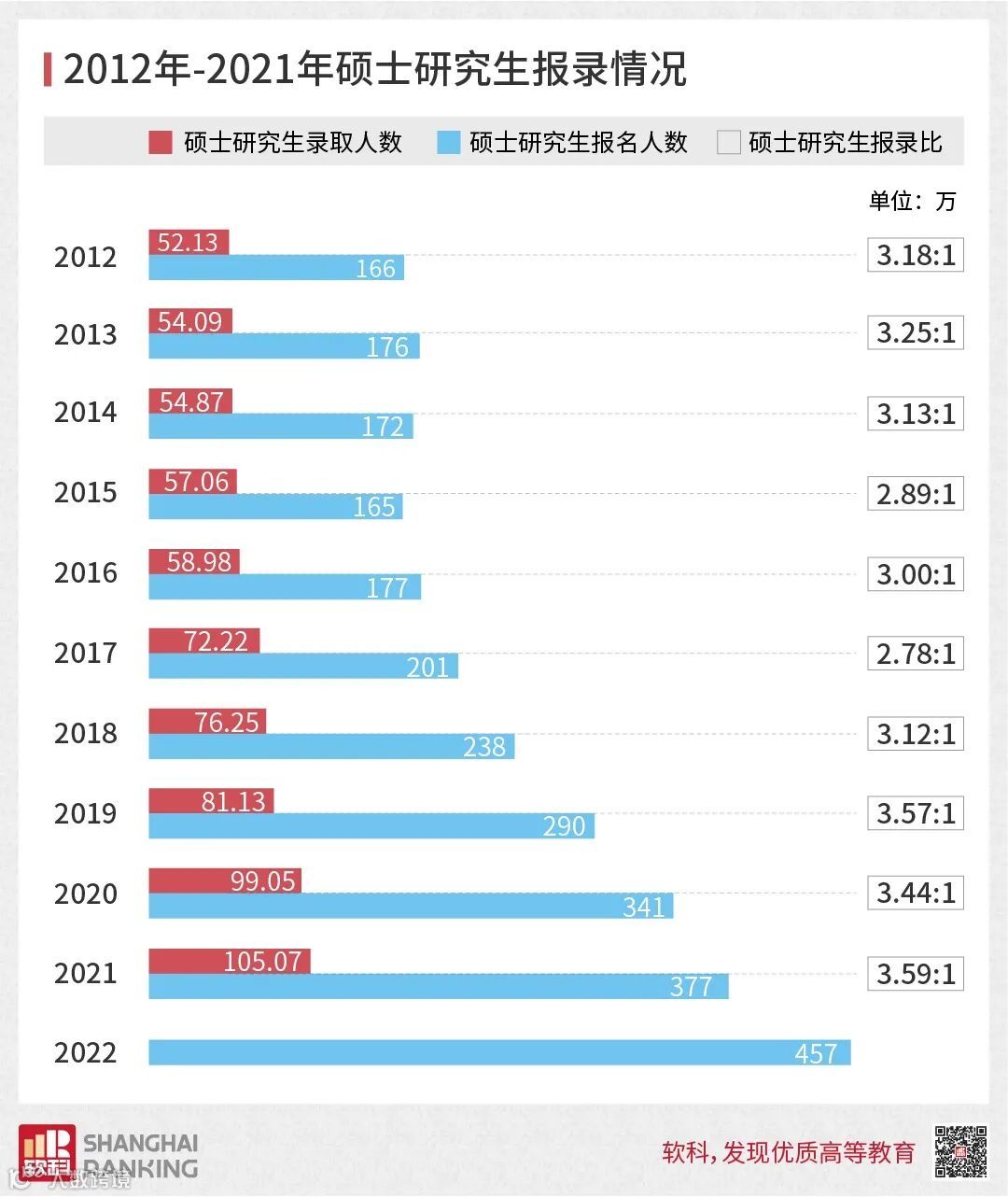 2021年,考研人数录取人数首次突破百万,报录比为3.6:1,2022年考研报名人数再创新高,比去年增加了80万人,达到了457万的历史峰值。纵观近十年的硕士研究生报录比,考研难度肉眼可见的加大。
