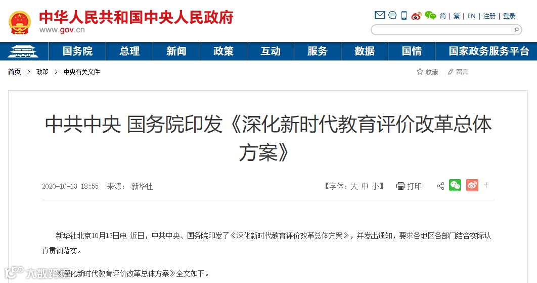 2020年10月13日,国务院印发《深化新时代教育评价改革总体方案》,提出各级公务员招录、事业单位和国有企业招聘要按照岗位需求合理制定招考条件、确定学历层次,在招聘公告和实际操作中不得将毕业院校、国(境)外学习经历、学习方式作为限制性条件。
