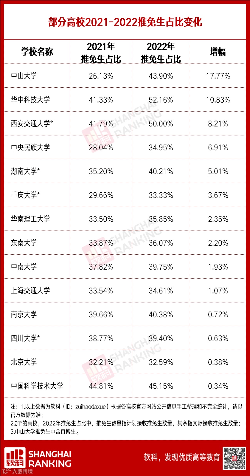 从全国部分高校2021-2022年的推免生占比来看,目前大多数“双一流”高校的推免比例实际上已经在不断上升,华中科技大学、西安交通大学2022年的推免生占比在50%及以上,中国科学技术大学、中山大学、南京大学、湖南大学等国内顶尖高校推免生占比也超过40%。