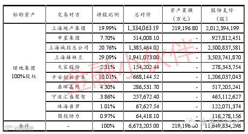 本次交易为上海金丰投资股份有限公司(以下简称“金丰投资”)以发行股份方式为支付对价,收购上海地产集团、中星集团、上海城投集团、上海格林兰、天宸股份、平安创新资本、鼎晖嘉熙、宁波汇盛聚智、珠海普罗、国投协力所持有的绿地控股集团有限公司(以下简称“绿地集团”)100%股权,其中向上海地产集团购买的股权为其所持绿地集团股权在资产置换后的剩余部分。本次交易绿地集团100%股权的交易价格为6,673,205.00万元,金丰投资将以5.54元/股发行11,649,834,296股股票支付交易对价。上市公司同时将全部资产及负债置出给上海地产集团,拟置出资产交易价格为219,196.80万元。本次资产置换与发行股份购买资产互为条件、同步实施。