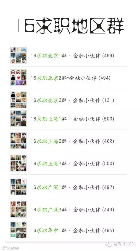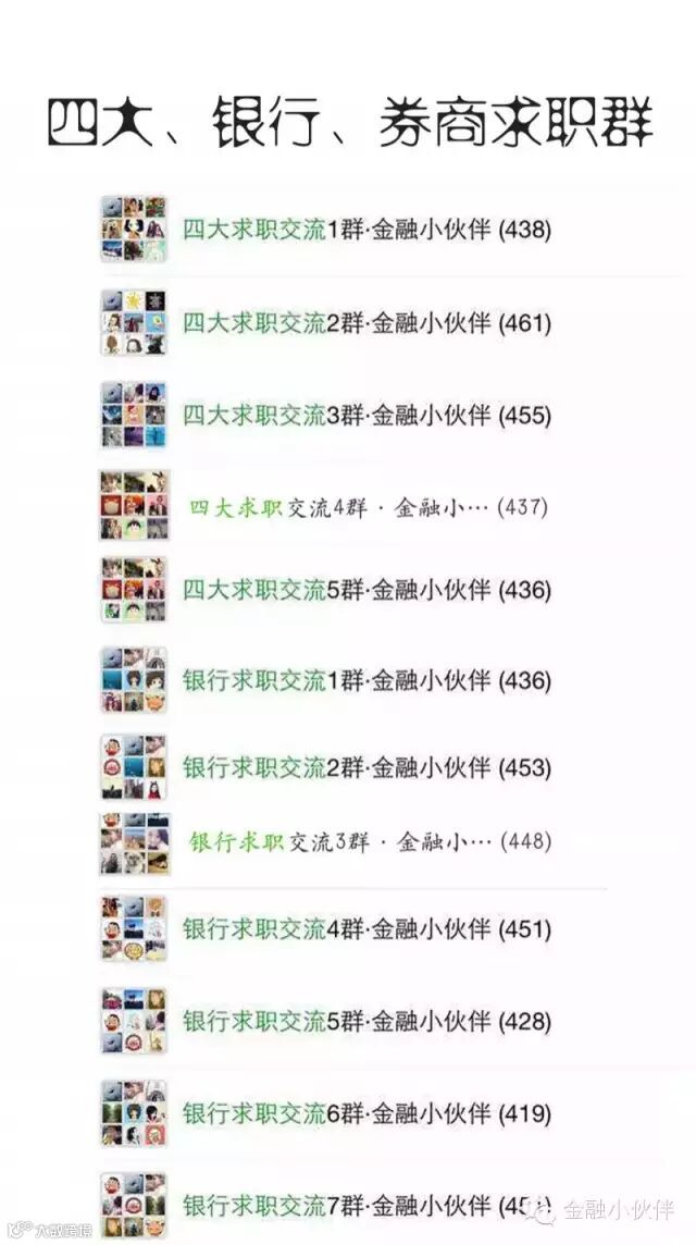 1、求职:北京、上海、广深、华中、海归求职(地区求职群)综合、银行、四大、券商投行、券商行研、券商资管(分类求职群)等等