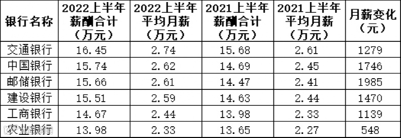工农中建交和邮储等六大国有银行,上半年平均月薪有所上涨。交通银行以2.74万元的平均月薪在六大行中排位最靠前。