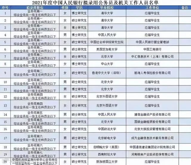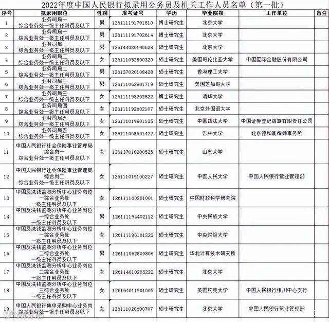 2022年中国人民银行公布了首批公务员和国家工作人员录取名单,一共录取了19人。他们不仅都拥有硕士以上学位,而且都是985、211等著名大学和国外大学的毕业生。