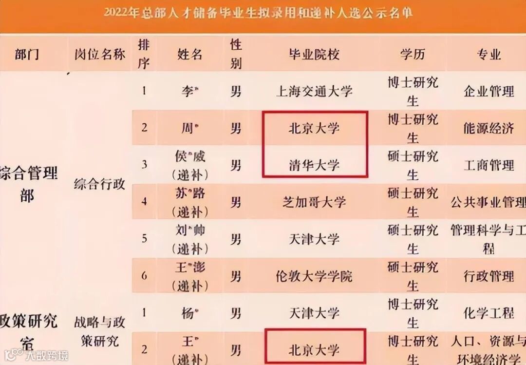 中石油发布拟录取招聘人员名单,清一色都是硕博,其中大量毕业生来自北京大学、清华大学、上海交通大学、浙江大学、天津大学等国内顶尖名校。