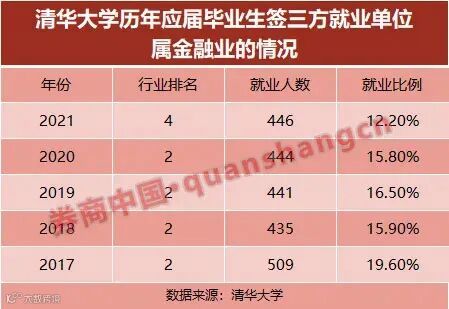 清华大学毕业生从事金融业毕业生比例也首次跌出TOP3,2017-2020年排名一直稳居第2位。