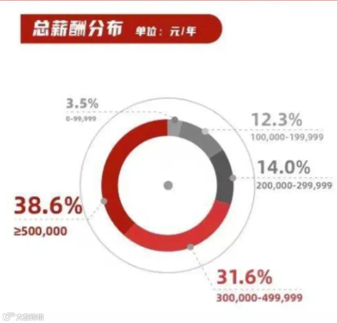 从总薪酬分布来看,70.2%的毕业生薪资在30万元以上,其中,31.6%的同学薪资分布区间为30-50万元,38.6%的同学薪资超过50万元。