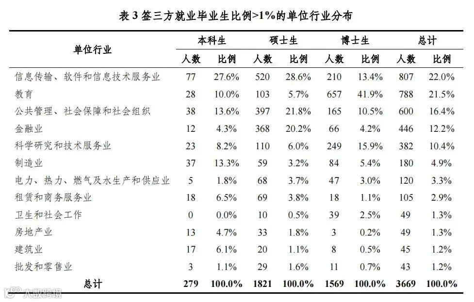 和2020届相比,清华大学本科毕业生选择信息传输、软件和信息技术服务业比例上升明显,从19.4%上升至27.6%;硕士生基本稳定,博士生从18.9%下降至13.4%。教育行业本科毕业生就业比例从19%下滑至10%,博士生则从28.9%上升至41.9%。