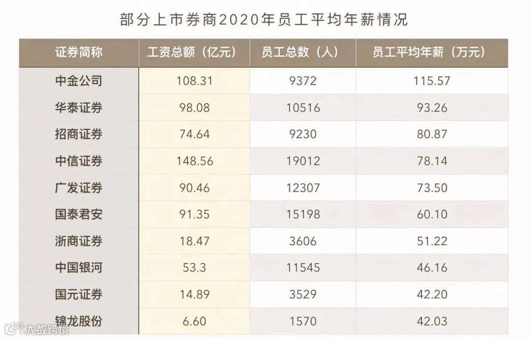 2020年,中金公司员工平均年薪高达115.57万元,华泰证券和中信也分别达到93.26万元和78.14万元,与互联网巨头腾讯、华为81万元和70.6万元的平均年薪相比只多不少。